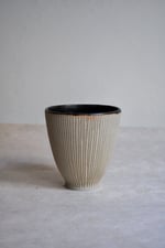 This cup is handmade on the throwing-wheel in a stoneware beige clay, glazed with a temmoku glaze suitable for food.