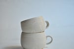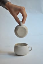 The glaze is a sophisticated Matte White with a velvety, tactile surface. During the firing process, delicate and unpredictable rosy nuances emerge, giving the piece a faint blush that makes every cup unique. It is a soft, ethereal finish that brings a sense of calm to your daily coffee ritual.