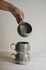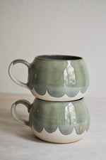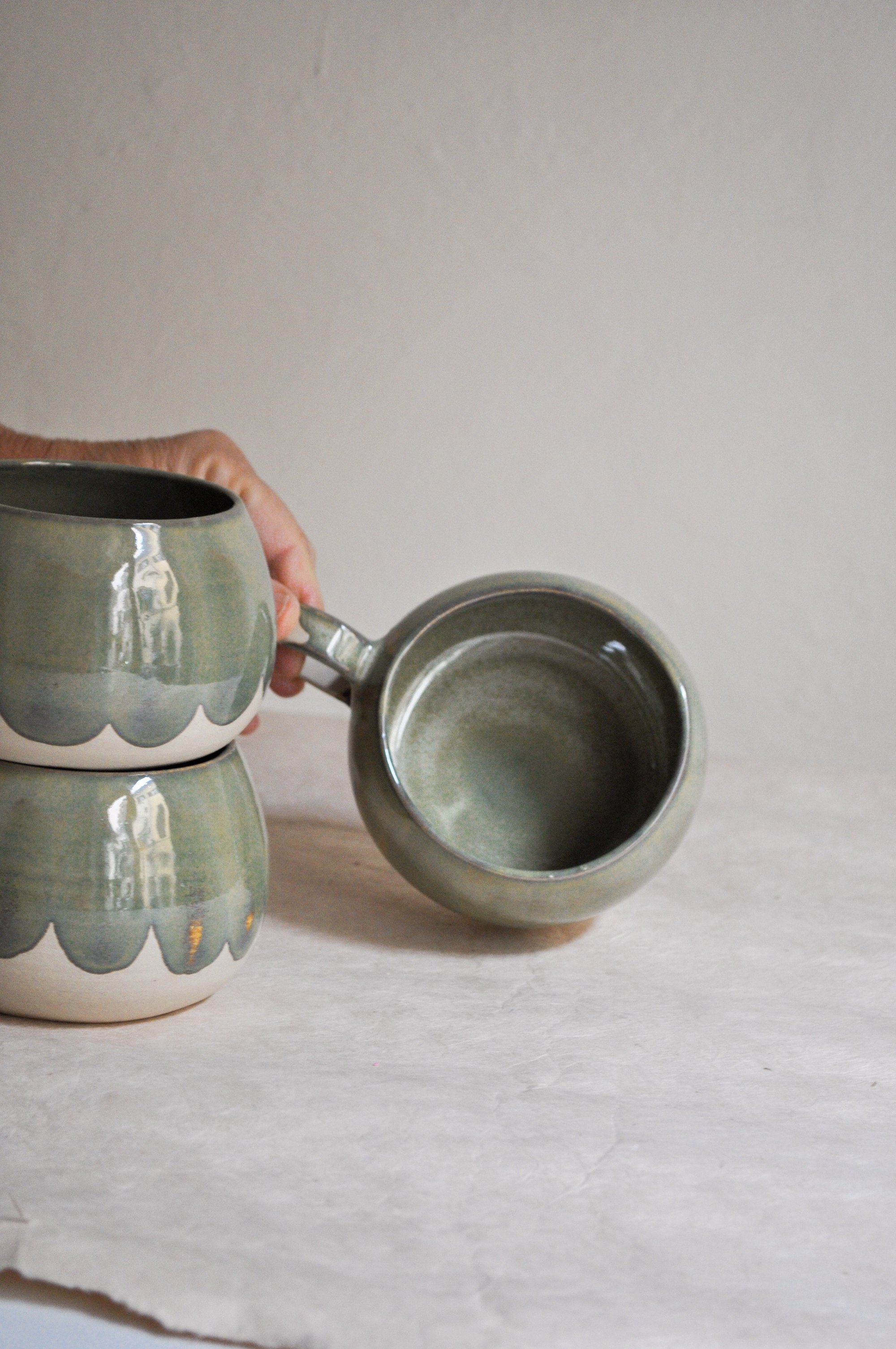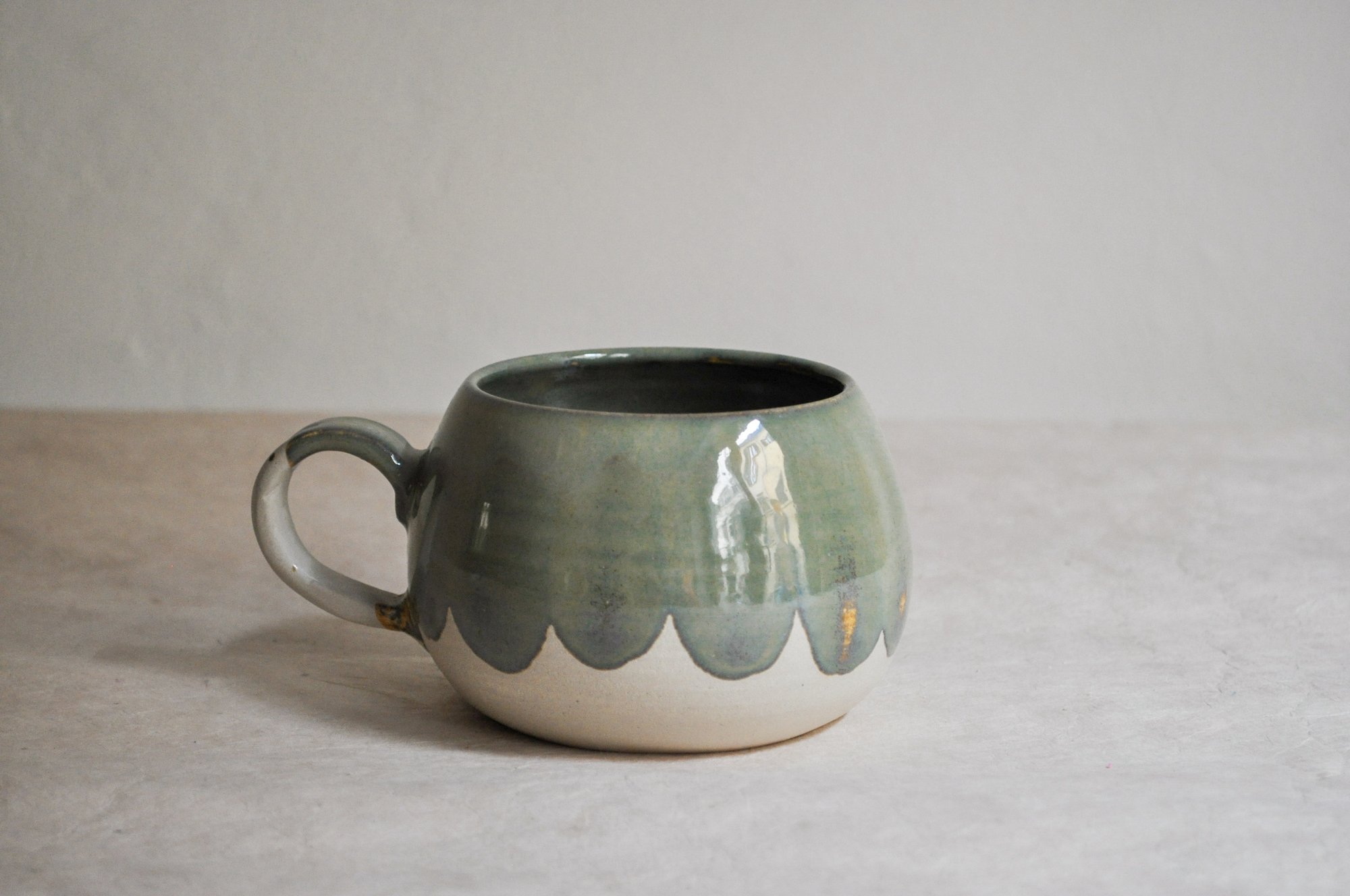 This mug is handmade on the throwing-wheel in a stoneware beige clay, glazed with a mottled green glaze suitable for food.