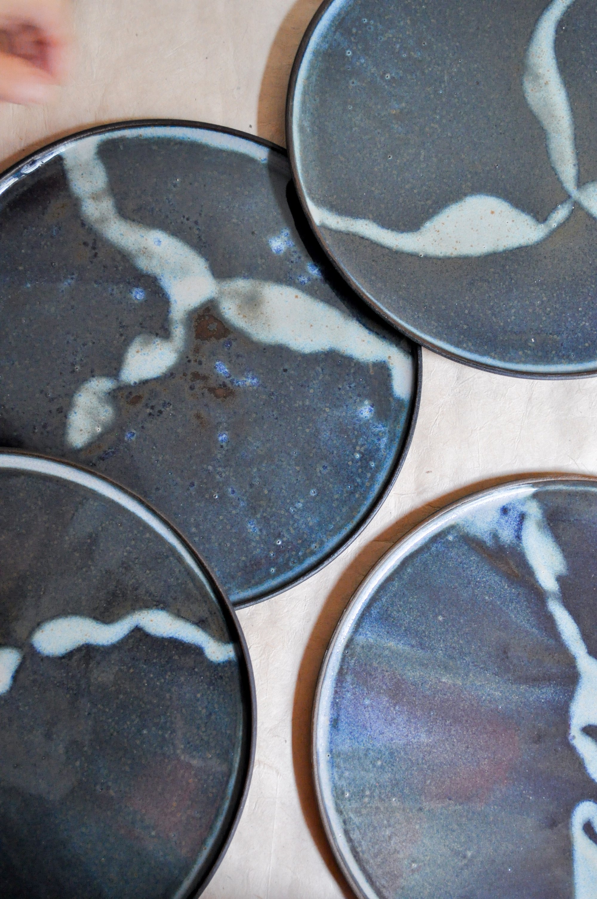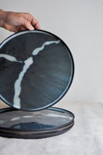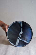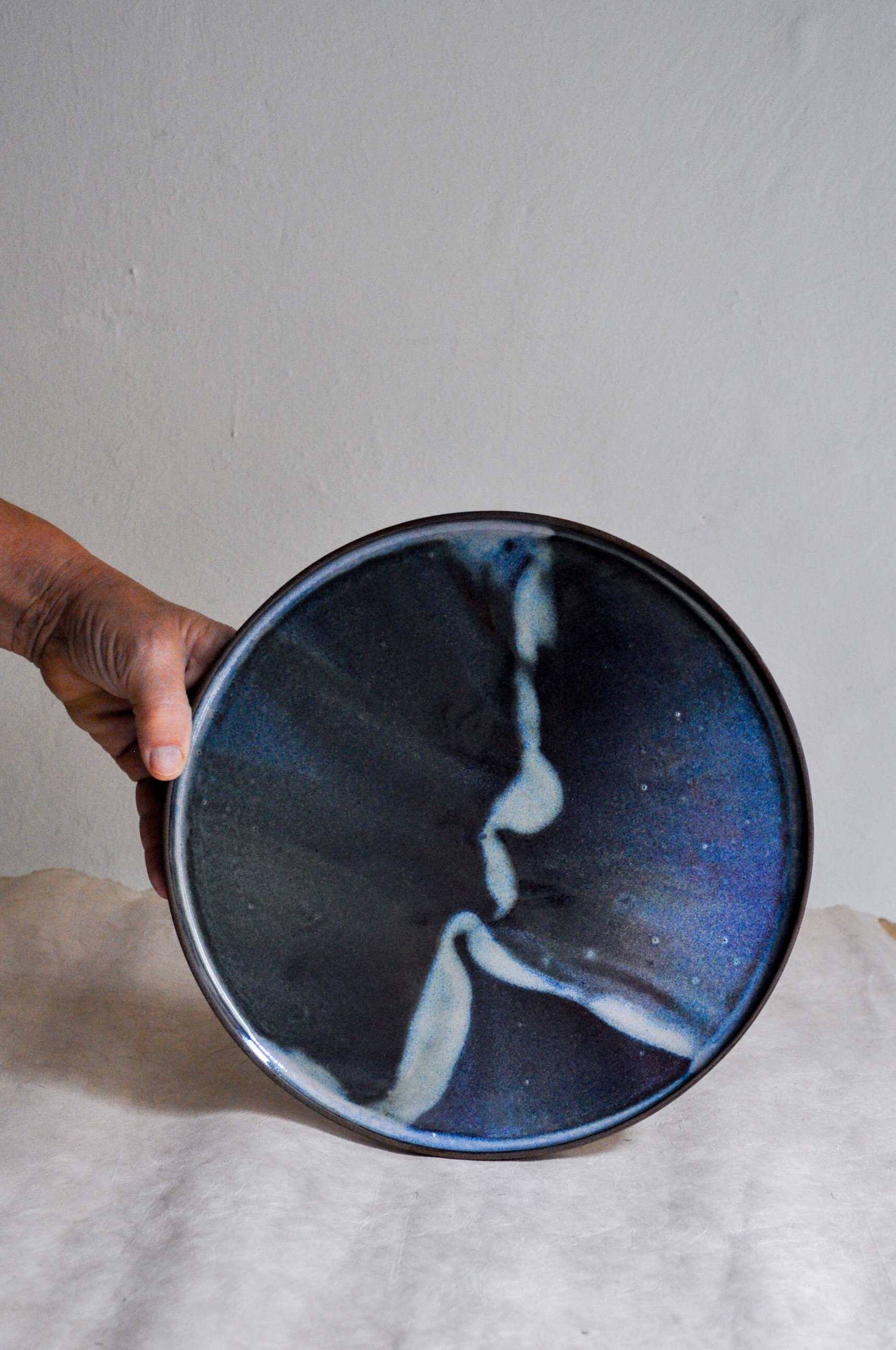 This plate is handmade on the throwing-wheel in a stoneware black clay, glazed with a mottled blue glaze suitable for food.