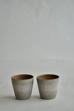 Despite its small scale, the cup showcases a detailed Porcelain Inlay: vertical white lines are hand-carved and filled with liquid porcelain, creating a delicate graphic contrast that invites touch. The upper rim and interior are finished with my self-produced Hazelnut Matt glaze, providing a warm, satin feel against the lips and a beautiful transition into the cool grey clay.